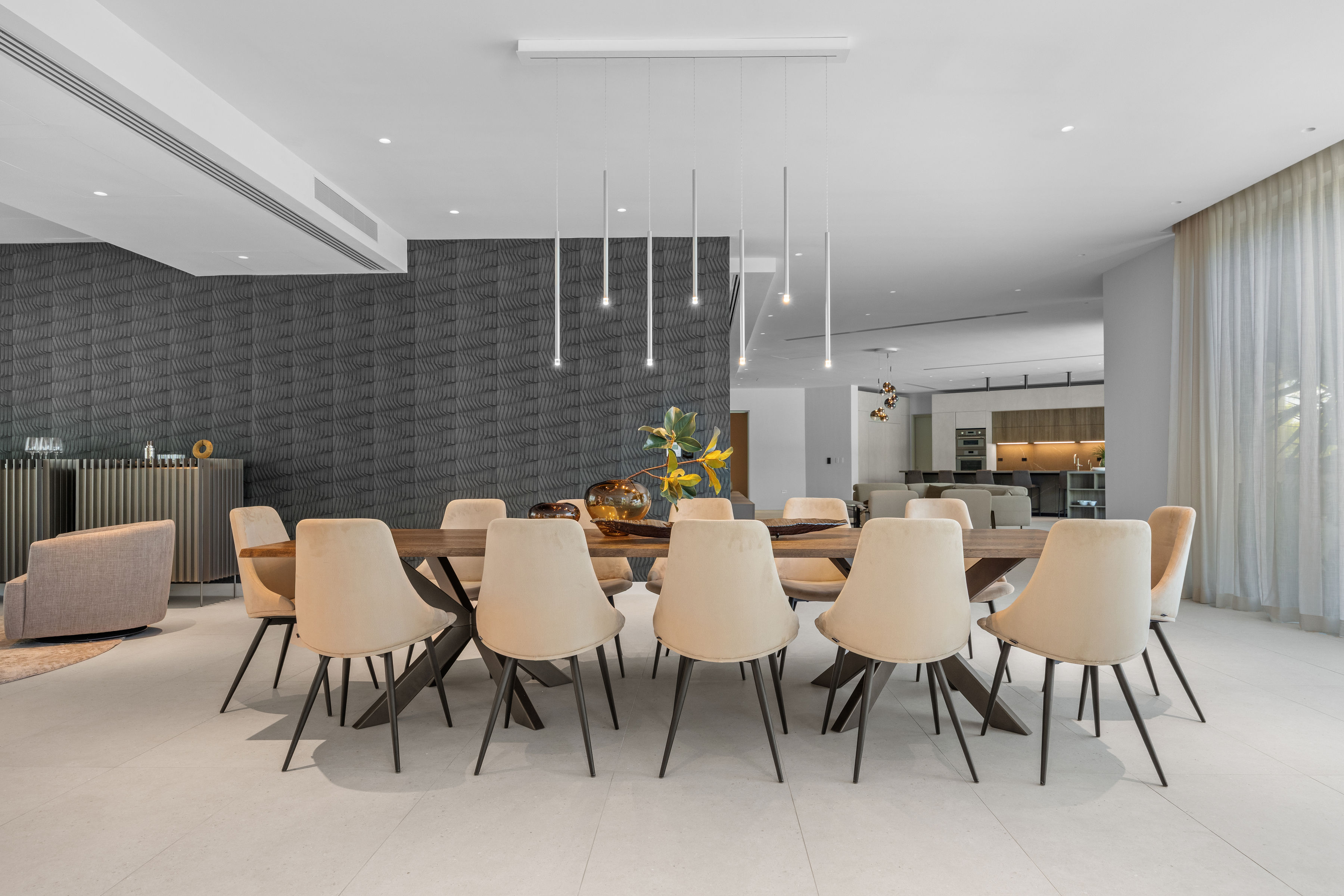 Designed as a statement of elegance and connection, this space blends custom furnishings, refined textures, and balanced proportions to create an atmosphere that feels both inviting and distinctly luxurious.
