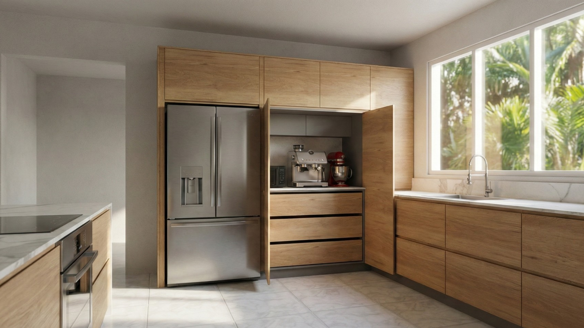 Continuous cabinetry was introduced to conceal the countertop area, reducing visual clutter while maximizing internal storage capacity in a clean and integrated way.